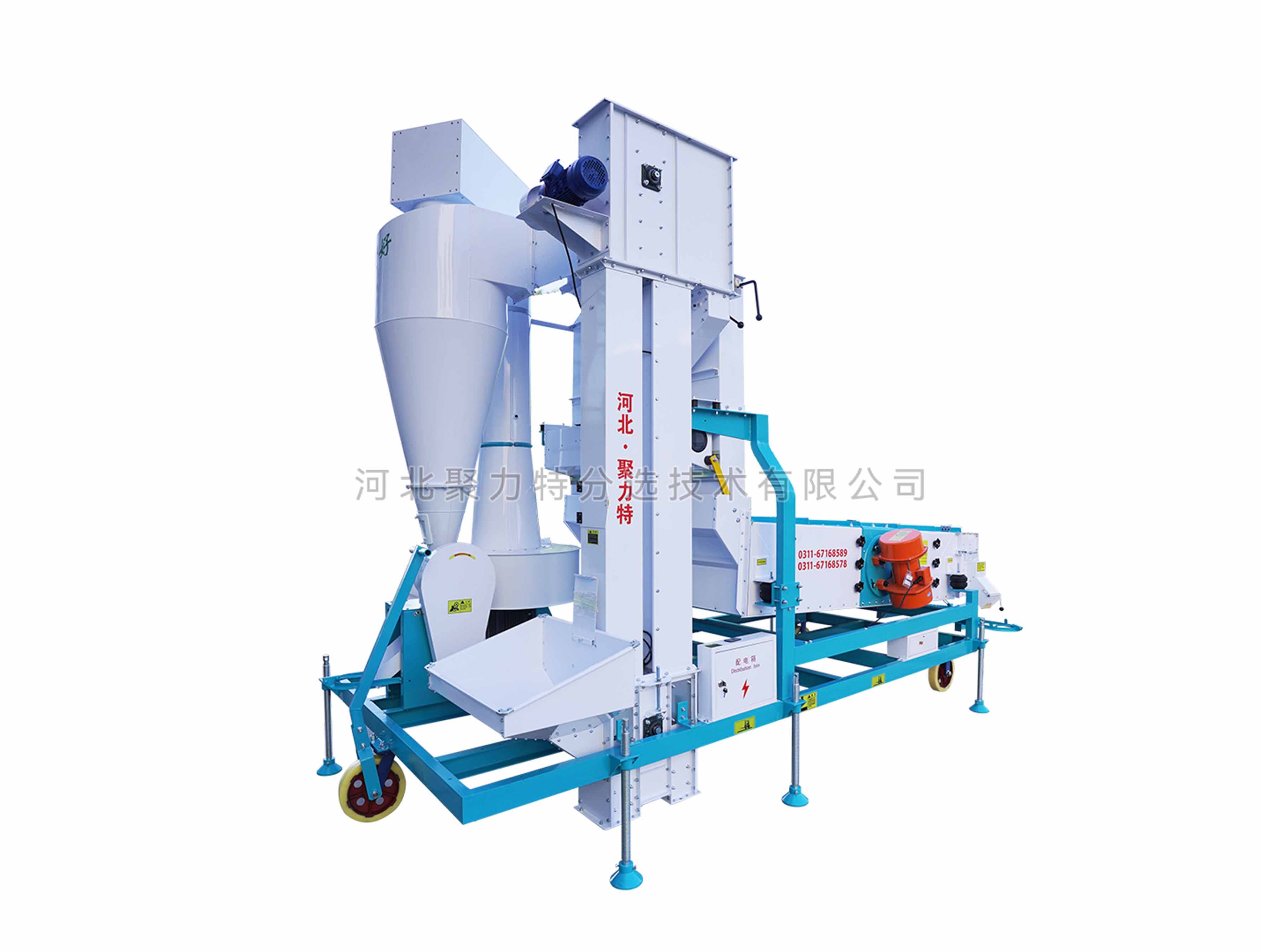 物料通過提升機(jī)進(jìn)入散糧箱,散糧均勻后進(jìn)入立式空氣篩,物料在風(fēng)力的作用下分離出輕雜質(zhì),經(jīng)旋風(fēng)除塵器過濾后,由閉風(fēng)器排出。物料進(jìn)入振動(dòng)篩,根據(jù)物料的外形尺寸來調(diào)整不同規(guī)格的精密沖孔篩片,去除大雜和小雜同時(shí)通過增減篩片的層數(shù)將成品分成大粒和中小粒。